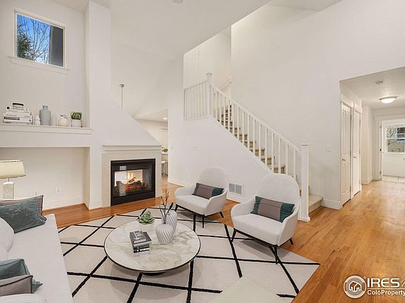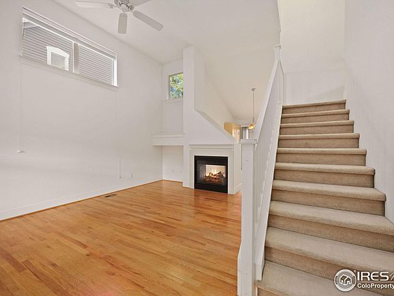 Unique 1.5-story patio home with a "cozy cottage" feel is tucked away from traffic in heart of Centerra. Hardwood flooring in great room, hallway + kitchen with double-sided fireplace separating dining area. Primary suite with a 5-piece bath, office, laundry, and powder room on main level. Two bedrooms + full bath on upper level. Full unfinished basement for storage or expansion. New tankless water heater, central air + updated kitchen appliances. Inviting front covered patio overlooks landscaping maintained by HOA. Back deck overlooks small fenced area for pets. Rear of home has limited view of the foothills + water. Close to walking paths, lakes, and parks w/easy access to I-25. Pre-inspected.