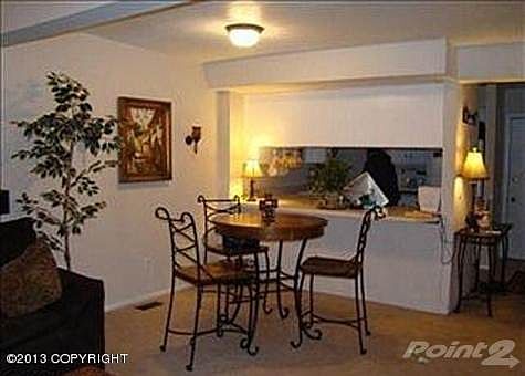 End unit townhouse w/ fenced in patio area & carport. Main level is open dining/living/kitchen w/ new countertops. Upstairs has 2 bedrms, full bath & laundry area w/ washer & dryer included. New vinyl flooring & carpet throughout. Sunny back deck w/ 2 raised beds & view of mountains. Very convenient location close to UMED, JBER, UAA & steps from Russian Jack Park & Trail System. Don't miss it!