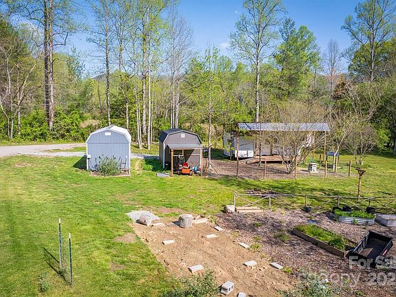 The land features a raised garden bed area, established blueberry bushes, peach trees, a rare pawpaw tree, etc!