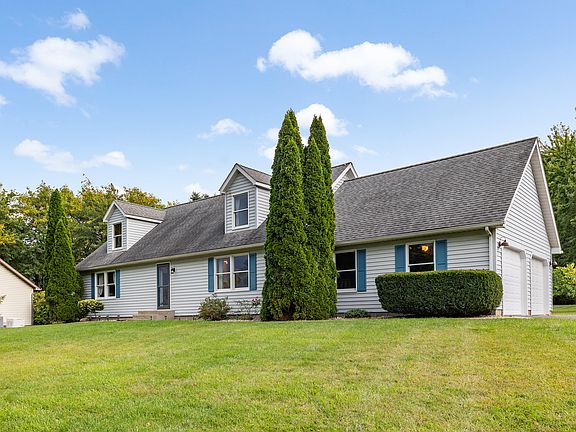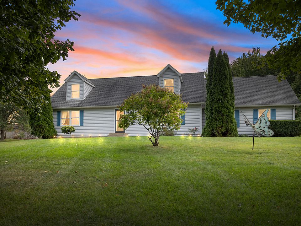SHOWINGS STILL OPEN. Buyers have 48 hours to remove contingency if we receive an offer.The home is located 15 minutes from Lake Michigan and 5 minutes from I-94, giving easy access to Chicago and Michigan. This charming Cape Cod-style residence boasts 3 spacious bedrooms and 2.5 bathrooms. The main floor features a cozy bedroom with an en suite 3/4 bathroom, perfect for single-level living. The open-concept family room, dining room, and kitchen create a seamless flow and offers a main floor 1/2 bathroom for guests. The kitchen is fully equipped with appliances and includes a convenient desk space. Adjacent to the kitchen, you'll find the main floor laundry room. The family room is a true centerpiece, complete with a functional wood-burning fireplace that adds warmth and charm. For additional living space, a large formal living room at the front of the house offers a perfect spot for more intimate gatherings or a quiet retreat. Upstairs, the second story features two generously sized bedrooms, each with walk-in closets, providing ample storage. A full bathroom on this level ensures comfort and convenience for all occupants. The exterior of this home is just as impressive as the interior. The large, well-landscaped lot is adorned with beautiful trees, offering a serene and picturesque setting. The house is perfectly positioned on top of a small hill, providing lovely views. The backyard is an outdoor enthusiast's paradise, featuring a stunning patio with a canopy, ideal for al fresco dining or simply enjoying the tranquil surroundings. Additional highlights include a spacious two-car garage and a long driveway, offering plenty of parking. The full, dry basement presents endless possibilities, whether you envision it as a storage haven or a future finished area to expand the living space. Don't miss the opportunity to make this exceptional Cape Cod-style home your own and experience the charm living in the heart of Vineyard Hills!
