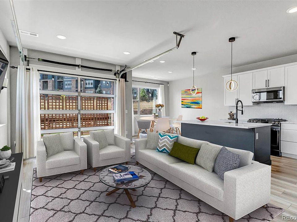 Corner-lot townhomeModern designUnique garage-style doorTall-ceiling garageModern comfortSleek black stainless appliancesThree generously sized bedrooms