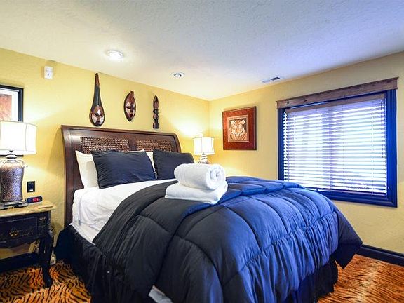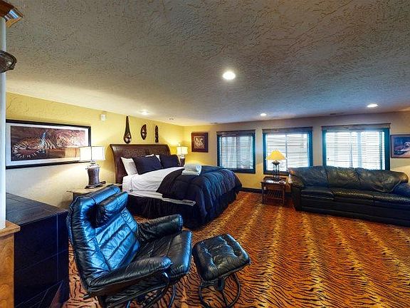 Nestled at the top of the hill with an eagle-eye view of the lake sits a truly unique vacation destination. The Cliffside Den will transport you to another world with its exotic charm. Upon arriving, you'll loop around the shared building and descend the stone steps to your own private entrance. You'll pass elegant landscaping, an elephant statue, and tiger paw print stepping stones along the way a taste of what's to come. But first, take a moment to enjoy the expansive lawn that stretches out to panoramic hilltop views of the lake below. It's quiet up in the trees, and this tranquil setting pairs perfectly with what you'll find inside. When you go through the door, the first thing you'll notice is the impressive tiger-striped flooring that stretches through the suite. Have a seat on the leather sofa (which doubles as a queen pull-out) and marvel at the luxurious wooden details, expertly designed to be wild-yet-comfortable. Setting the mood for an entertaining time, this spacious main living room also contains a plush queen bed, a dazzling gas fireplace, a large TV, and a glass-top dining table for two. Around the corner, the large suite continues to reveal a black tile vanity with hand-carved elephant details, a bright mirror with plentiful lighting, and a stunning open glass shower. Round the corner to the well-stocked kitchen where polished wood cabinets and black tile countertops complement the black appliances. A breakfast table and two wicker chairs cozy up to the coffee corner where you can make a cup or two on the Keurig. On the other side of the apartment, you'll find the master bedroom where the signature style continues. First, the en suite welcomes you with a glass shower, pedestal sink, and multiple light-capturing mirrors to make this a bright space to prepare for the day. Through the adjoining door, the master bedroom boasts a lavish four-poster queen bed, TV, desk, and elegant seating for two by the window so you can admire the beautiful view through the large windows. A dignified dresser, spacious closet, and tall bureau complete the space, allowing you ample room to make yourself at home. When you're done exploring, relax on the patio's lounge furniture and watch the deer stroll through the yard as you watch the sun set across the lake. Your journey to Cliffside Den will feel like an expedition. *This is a shared property. You will have the full lower-level suite to yourself with a private entrance. The occupants above host a weekly Monday evening gathering, and street parking may be limited. Tenant is responsible for a flat monthly fee of $2,250, a damage deposit of $2,000, a flat monthly fee for utilities of $250, and a pet fee of $250 if applicable. Owner must approve. No smoking on the property. First month, damage deposit, and utilities for the first month due at signing.