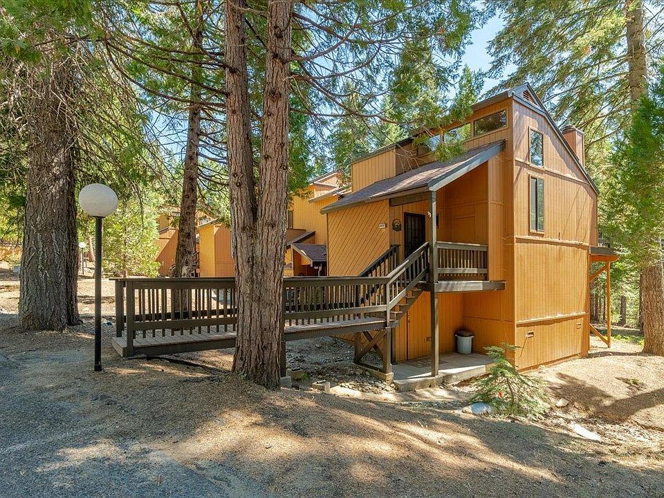 It doesn't get better than this! Excellent location with good parking and easy access. You won't have far to carry your groceries. This is a rare light filled end unit that backs up to the forest with great tree views. You will love the huge shady deck, perfect location, gorgeous kitchen, updated bathrooms and open floor plan with vaulted ceilings. Updates include custom wood bench & trim in tiled entry, newer wood kitchen cabinets with glass accents & under cabinet lighting, tasteful granite counters, stainless/black appliances & convenient pellet stove with tiled mantle in the living room to keep things warm and cozy. If you are a wine lover you can store your bottles in the custom walk-in cellar built under the covered entrance way. You can truly enjoy this move in ready condo with all furnishings included. Best part is location with two decks with private forest views. Escape the heat & enjoy blue skies & clean air at 5500 ft. For the same cost as just fire insurance on a house, HOA provides insurance AND does all exterior maintenance: roof, painting, snow plowing, pine needle removal, plus pool, hot tub, sauna, trash, seasonal boat/RV parking, AND peace of mind - no surprise big bills. The pool was recently re-plastered. This modern mountain condo is only 5 minutes to the lake and 30 min to the slopes at China Peak. Best part? Relax while the HOA does ALL the outside work for you, and the dues are going DOWN to $550/month with fire insurance *included*!