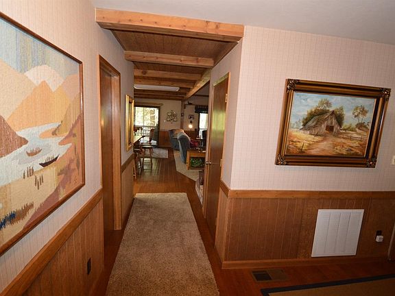 This is a superb second home, perfect for gatherings with loved ones. The main living area is a large great room with the kitchen, dining and living rooms wide open to each other. There are 3 generous bedrooms, one on the main level and two upstairs, and two full bathrooms with tubs and showers. The great room ceiling is high making room for a loft above the kitchen for extra sleeping space or a separate play area for the kids. The entry and lower hallway are spacious as well. There is a lot of wood on the interior of this warm and cozy cabin including hardwood in the kitchen, hallway and entryway. Great all around cabin which could make a great vacation rental.