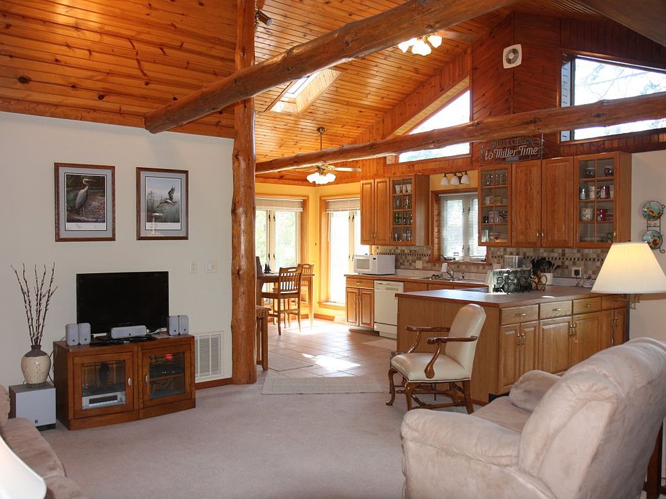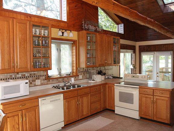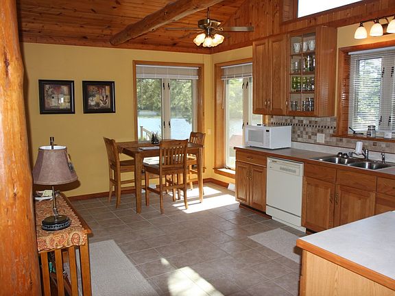 This Rhinelander Chain/Wisconsin River home offers 3 bedrooms, 2 bathrooms, very attractive & spacious kitchen with an adjoining dining area and windowed views of the water, open family room with a vaulted ceiling & skylights, & a sunken living room with water views & a fireplace(currently non functional). Other features include a contemporary bathroom with skylight, lake facing deck, beamed & vaulted ceilings, 3+ car garage, extra storage shed, & a wonderfully level approach to 170 feet of river frontage with an island view. The waterway in front of this home is slow, no wake due to the island for quieter enjoyment of the home. It is also just a "skip" to town & is located off County W quite some distance quieting the sound of passing vehicles. Enjoy fishing, boating, swimming, snowmobiling & all that living on a fully recreational body of water offers!!