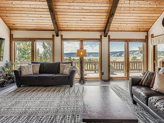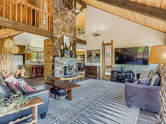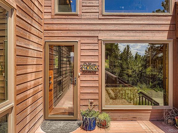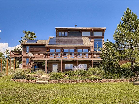 Discover the ultimate Colorado lifestyle in this stunning custom mountain home, just a short 20-minute drive from Castle Rock. Spanning 5.3 acres, this multi-level gem offers 4 bedrooms, a loft, and 4 bathrooms. Step inside to an open floor plan, where a grand great room showcases breathtaking mountain and valley views, a two-story stone fireplace, and charming tongue and groove pine accents. The updated kitchen features a large granite island, double ovens, and sleek granite countertops. The adjoining dining room makes entertaining a breeze with its convenient kitchen pass-through. Retreat to the primary suite with its private deck, ideal for morning coffee or yoga. Additional features include two more bedrooms, a versatile loft for an office or library, and a finished walk-out basement with a family room, bedroom, kitchenette, and bathroom. Enjoy outdoor living with fenced areas for pets, gardens, and a chicken coop. An attached two car garage and a 1085 square foot multi-use addition provide ample space for all your needs. Plus, benefit from a $70,000 solar system fully paid by the seller at closing. Experience peaceful mountain living at its finest.
