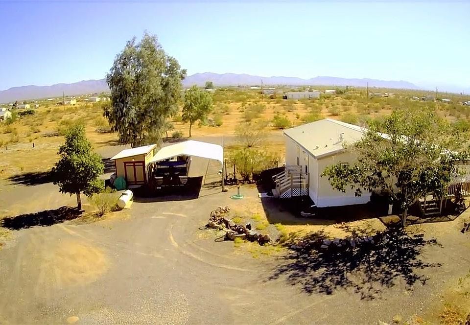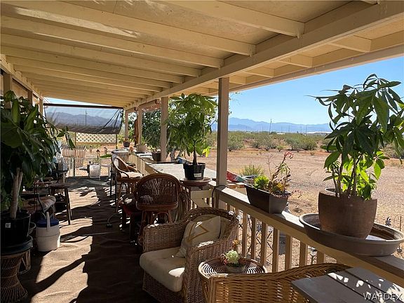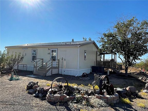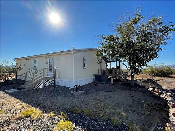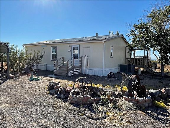 Cute & Clean home on over 1 ACRE with amazing views!! Enter this circular driveway, wraps completely around home. Bring the family and bring the horses, everyone welcome. There's enough acreage for your horses and livestock, make this your very own homestead. Not far from paved road and town, yet still private with 1.17 acres. Keep your boat or vehicle covered with this 40 X 20 carport. Two sheds convey, one shed could be a "man-cave"...has loft, shelving & radio installed. Home has Rural water with a water meter for convenience...just like having City Water. RV Hookups-Electric outlet with water! This 3 bedroom, 2 bath home is Move-In-Ready and has been well taken care of. This owner takes pride in the home and has added new heat pump, landscaping, fresh paint, new decking material, water softner and more! The kitchen has ample space and storage and has new stainless steel appliances. Window coverings offer wood-faux shaded blinds and curtains. Entertain and BBQ from your very own back patio, outdoor kitchen with sink and fridge. Walk out to the covered patio from the master bedroom. TREES, cacti, plants and lots of greenery...Peach, Pomegranate, Granny Apple, Mulberry, Chinese Silk, Eucalyptus and more!. Mature trees and landscaping sets this home apart from others. Come take a tour today! Golden Valley is only 15 minutes from Kingman and less than 1/2 hour from Bull Head City/Laughlin area. The Colorado River offers swimming, boating and fishing to fulfill all your water activities.