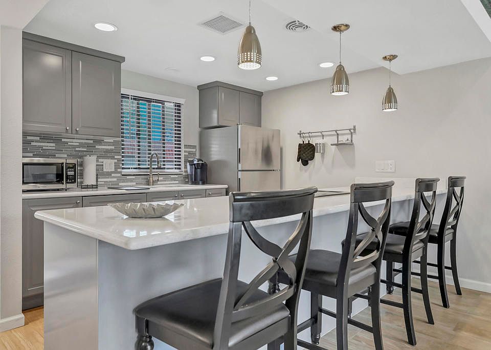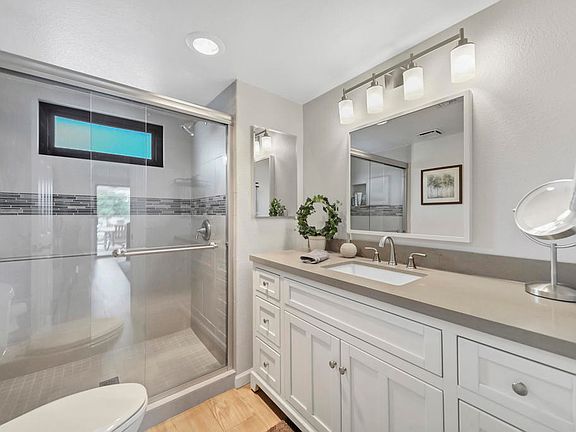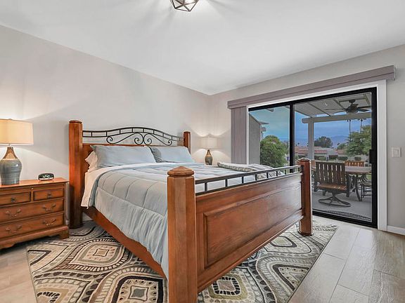 Substantial price reduction! Great northeast facing unit on a green belt. This fully remodeled 2 bedroom 2 bath unit, is up to the minute in it's decor. The spacious living room boasts volume ceilings and a custom ceiling fan. The kitchen has been opened up to the living room and has quartz counter tops, glass tile backsplash, custom cabinetry, with oversized drawers, and stainless steel appliances. Both bathrooms have been remodeled with quartz counter tops, custom cabinetry, light fixtures, and beautiful shower surrounds. To add to this exceptional unit the covered patio has been extended and has a ceiling fan with ambient lighting. New windows and sliders, new wood like tile throughout, new hardware and new custom fixtures. The laundry has been moved inside. This stunning Vintage model with the bedrooms separated by the living area is move-in perfect. Located in the very active Palm Desert Resort and CC. 18 holes of championship golf, pickleball, tennis and bocce. 20 pools and spas. Conveniently located in the heart of Palm Desert, a short distance to El Paseo shopping district and the Acrisure Arena. Short term rentals are allowed. This unit is being offered furnished. Immaculate!