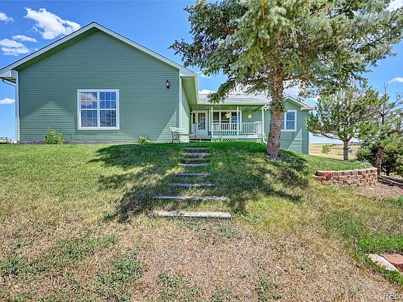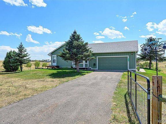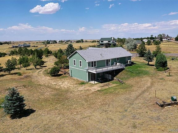 Welcome home to this 5 acre property with expansive views from Pikes Peak and to the northern mountains. This home has a walkout basement with a finished family room and new 3/4 bathroom. The maser bedroom is large and boasts and en-suite 3/4 bath with 2 sinks, large walk-in closet. 3 bedrooms (including the master) upstairs, all with 4-year old carpet. The kitchen is nicely connected to the living areas of the home with an eat-in bar (quartz counter tops), new flooring and updated stainless steel oven with matching range hood. Sliding glass door off dining room leads to a 10x30 trex deck. Swamp cooler will keep you cool on the hot, dry summer days. The basement is 35-40% finished with the rest left for storage or for you to complete it. The outside boats natural grasses with a small yard to water with lots of potential for garden areas etc. 24x24 2-car garage. Radon mitigation system already installed and sellers recently had the well redone. Two fenced in paddocks for animals with one yard hydrant as well as a small shed for animals. Don't miss the opportunity to call this property your home, just minutes south of Bennett, 25 minutes to DIA and Southlands Shopping Center.