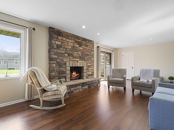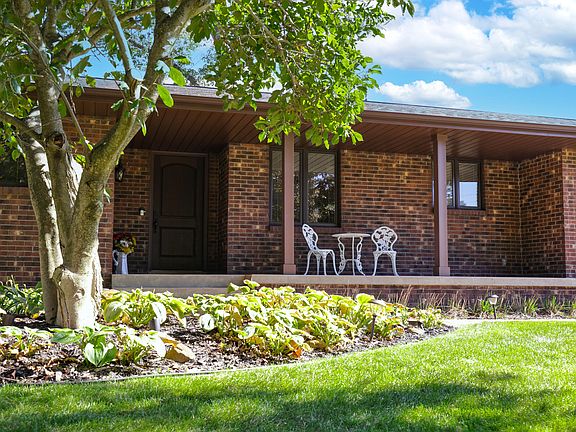 Impeccable All-Brick Ranch with Modern Updates! This meticulously maintained 3-bedroom, 2.5-bath ranch is a true standout, offering both comfort and style. A welcoming covered front porch sets the stage for this exceptional home. Inside, the inviting living room showcases a beautiful floor-to-ceiling stone gas fireplace, creating a warm and elegant ambiance. The spacious primary bedroom features a renovated ensuite bathroom, complete with a walk-in tile shower. Convenient main-floor laundry adds to the home's everyday functionality. The full, dry basement is mostly finished and features a wet bar area and cozy gas stove making it ideal for entertaining, creating a recreation area, or expanding your living space. Plus, there's ample storage! The oversized, heated 2-car garage provides plenty of space, while the perfectly landscaped yard is effortlessly maintained with an irrigation system. Step through the sliding glass doors into your peaceful backyard retreat, complete with a stamped concrete patio, charming swing, and custom-built bar--perfect for relaxing or gathering with friends and family. Adding even more charm and functionality, an 18x12 shed--straight out of a magazine--complements the outdoor space beautifully. Recent updates within the past five years include a new roof, whole-house Generac generator, wrought iron fence, garage door, quartz countertops, stainless steel appliances, luxury vinyl flooring, primary bathroom renovation, updated lighting fixtures, new water softener, pressure tanks and pump for the 4" well, and fresh paint throughout. Don't miss out on this move-in-ready beauty--schedule your showing today!