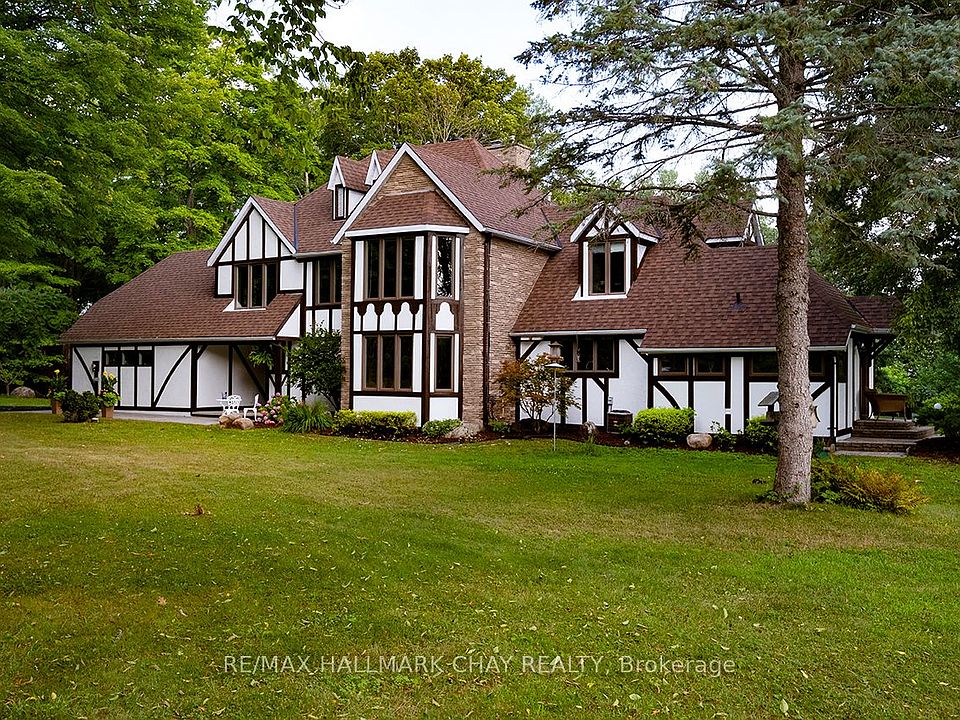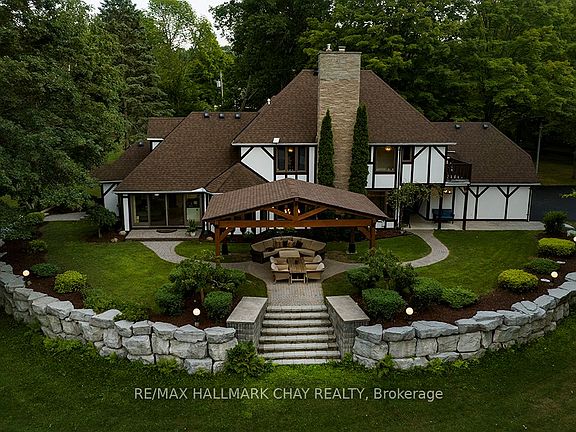 Exquisite English Tudor Estate 3.785 Acres of Panoramic Beauty in Rural Tay Township. Custom-built architectural gem on a private cul-de-sac, surrounded by nature. Offering a sense of seclusion & grandeur that is truly a one-of-a-kind. Designed for comfort & elegance, the home features dual-zone propane forced-air furnaces, upgraded insulation, & near floor-to-ceiling windows that frame year-round views of the park like setting.Gourmet kitchen is a chefs dream with granite counters, JennAir built-in double ovens, JennAir stovetop island, stainless appliances & a spacious 2nd large island connecting seamlessly to the dining & sitting rooms. Luxury double doors lead to an expansive terrace with 2 bbq hookups & a custom 15' x 21' pavilion overlooking manicured grounds.The back property, an incredible blank canvas for your ultimate outdoor oasis. Whether you dream of a pool, cabana, outdoor kitchen, or another entertainment feature, bring your vision to life here.Inviting living room offers a stone propane fireplace & walkout to both the breezeway & terrace. The elegant spiral staircase leads to 4 upper level bedrooms, incl the primary suite with walk-in closet, spa inspired ensuite with oversized jet soaker tub, heated floor & Juliet balcony. The main floor offers a versatile 5th bedroom, originally used as an office, plus a well-appointed laundry room with abundant storage.Finished lower level features a theatre room, exercise space & display of art with endless possibilities to customize to your needs. Highlights incl. a heated dble garage & a location where the school bus drives along the st.Enjoy an easy commute via nearby Hwy 400 & a central location 30 min to Barrie & Orillia & 15 min to Midland. Go snowmobiling from your front door. An exceptional blend of timeless craftsmanship, modern luxury, ideal for the discerning buyer seeking both sophistication & a perfect setting to raise a family & entertaining guests. Don't miss out!