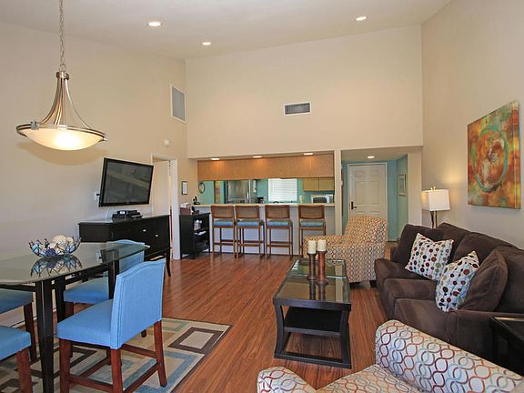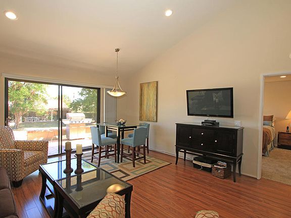Price drastically reduced. Hurry on this one! The best location in the neighborhood. A short walk to the club house, pickle ball courts, and golf course, yet tucked away in the center of the community. This single level Condo, in the popular PD Resort CC has two large master suites and both have their own private bathroom. Each master suite has a super large walk in closet and access via sliding glass door to the large patio. There are two beautifully remodeled Bathrooms, new flooring, recessed lighting, custom paint throughout, and newer furniture. The hardwood floors and carpeting are approx. 1 year new and condo has not had visitors in over a year. The non Popcorn, Vaulted ceilings in the living area has recessed lighting as does each bedroom which is normally not found in these units.Enjoy the expansive, tiled and elevated back patio with panoramic mountain views.This would make a great rental or second home. Guard gated with golf course (pay and play), fitness center, club house, tennis and Pickle ball. HOA dues are $539 per month.This condo is being sold turnkey furnished.Short term rentals allowed. Minimum 2 day stay!