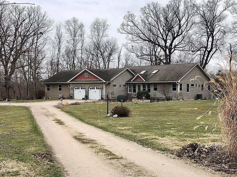 Creek view ranch. East end of property is solid woods, 1600 sq ft of basement has trim, doors, electrical & drywall except for the outer cement walls and floor is unfinished with a finished full bathroom except for flooring. Basement also has gas hookup for 3rd kitchen &/or fireplace. 2.3 acres but much of the surrounding acres will never be developed. 1/4 mile long view of the creek from kitchen & living room. House sits on a ridge above the Big Indian Creek. Secluded property 1/4 mile off of rt. 23. 20 minutes southwest of Sandwich & 15 minutes north of Farm & Fleet & I-80, Ottawa. Some of the photos show the east end of the home which serves as master suite/in-law suite or easily turned into a large family room since hardwoods go under the cabinets in this 2nd kitchen. Could easily close off to add a 4th bedroom as well. The Great Room is 39' x 16' with wood-burning fireplace and 4 large skylights. 9 rooms total on 1st floor with 2.5 baths and 3rd full bath in basement. Buyer's agent welcome.