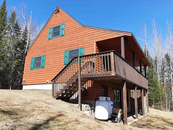 Tucked in on 11.6 acres overlooking gorgeous mountain views, you have to come see for yourself. The log sided home was well constructed in 2007 and certainly always well cared for. A covered porch is the perfect place to admire the views. Inside, not large but so comfortable and well designed. An open kitchen-living room with nice flooring and natural wood details. The perfect custom built island was recently added giving seating for 4, more counter space and storage. A first floor bedroom with double closet. The second floor offers a bedroom and another room to use as a family room or more sleeping space or office. The basement is a convenient walk-out with large double doors. Neat and clean, woodstove that can be use as your primary source of heat if desired, laundry with washer & dryer included, and gas hot water on demand. In 2018 the owner constructed his dream garage; oversized 28x32, heated, electric doors, stairs to huge storage above and even an added 12x32 carport! Any and all storage needed is here and is a great place to work & finish any project. LED lights in both house and garage. House was stained in 2019. Driveway has been widened and gravel resurfaced. Snowmobile trail is nearby & accessed by permission. This home is very private, on a paved town road and yet only 5-6 minutes back to town. You will so enjoy coming home every day to this special place or if your vacation get-away you will find it hard to leave!