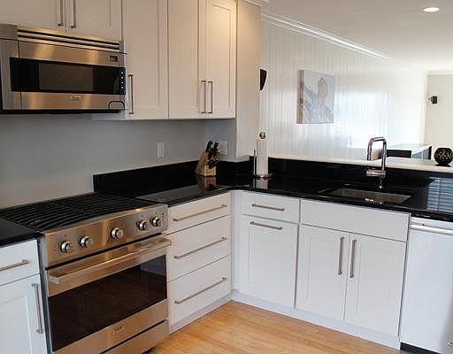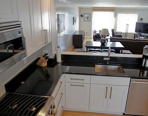 Bright & updated Townhouse w/westerly water views & private deck. Offering new custom kit. w/Viking appliances & granite, wood floors in DR & LR. LR w/wood burning FP, 2 BR, 2.5 BA, loft, A/C, 2 covered parking spaces. All in the heart of the Old Port.