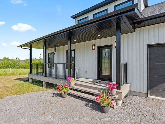 Stylish, spacious, and just a few years young, this quality-built bungaloft offers the perfect blend of modern comfort and country charm. Set on 2 acres, it features open-concept living, vinyl flooring throughout, and tons of natural light from the many windows. The main floor includes a bright kitchen, dining and living area, mudroom with laundry, and a versatile second bedroom with a separate entrance. The primary bedroom is thoughtfully designed with a walk-in closet, 4pc ensuite, and cozy heated floors. Upstairs, you'll find two additional bedrooms and a 4pc washroom, perfect for family or additional guests. The walk-out basement offers endless potential with above-grade windows and rough-ins for a bathroom and kitchenette.