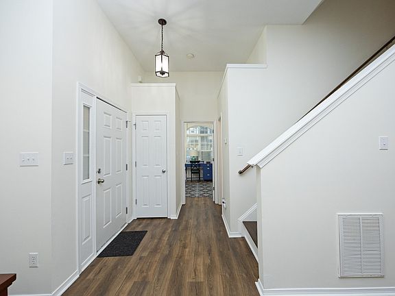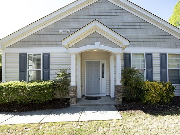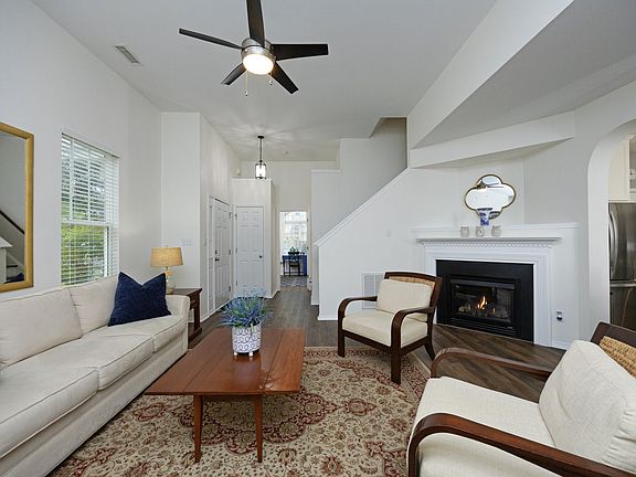 Semi-detached, meticulously maintained end unit townhome in Town Hall Commons. Freshly painted throughout, updated with LVP flooring downstairs. Bright living room welcomes you with full light, vaulted ceilings and cozy fireplace. Living room enters to covered patio and beautifully maintained private and fenced backyard. Kitchen equipped with custom built cabinets, gas stove for chefs, granite countertops, tiled backsplash, island, stainless refrigerator and dishwasher. Kitchen leads to dining room. First floor bedroom with full bathroom. Primary suite on the second floor has cathedral ceiling, walk in closet, large bathroom with dual vanities, soaking tub and separate shower. Hidden unfinished large storage space located of the walk-in closet in the owner's suite. Third bedroom with walk in closet, full bathroom and laundry room also on the second floor. Two car garage with storage room. HOA dues include access to the Clubhouse with propane grills, playground, full 25 m lap pool with shallow and deep ends. Steps away from Town of Cary Indian Creek Greenway, close to Wegmans, shopping, town of Morrisville events, farmers market and only 7 minutes to RDU!