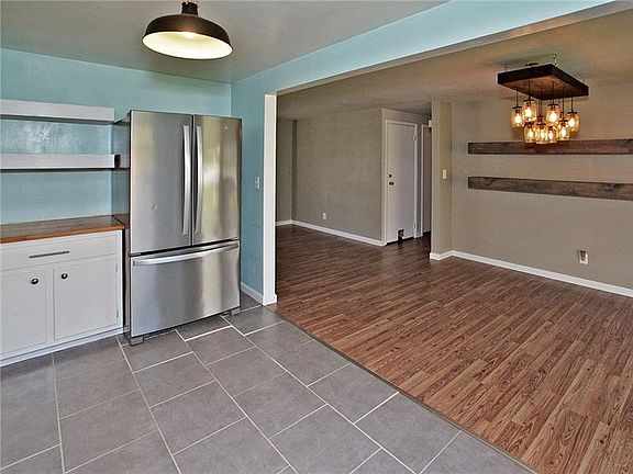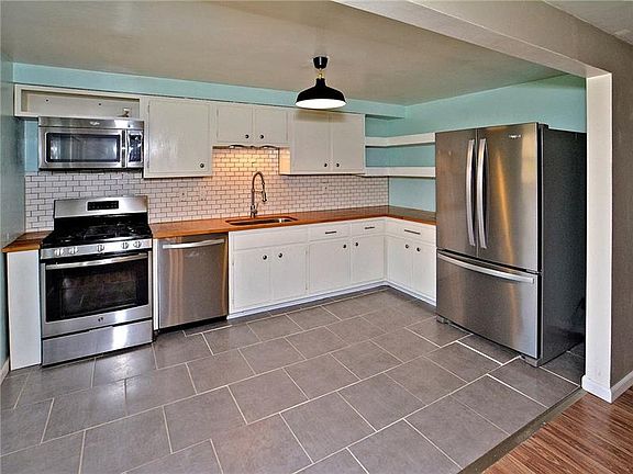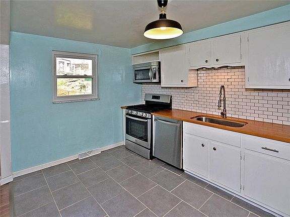 Charming brick ranch with 2 covered porches and beautiful fenced in level rear yard! Functional kitchen with stainless steel appliances, subway tile back splash, updated butcher block counters, farmhouse sink, shelving, lighting and flooring leads to accommodating dining room with farmhouse chandelier & rustic shelving with slider that leads to porch and yard. Spacious living room with huge bay window for tons of natural light. First level has updated flooring throughout. Main bath with subway tile, updated shelving and lighting. Huge basement partially finished with separate laundry, vented glass block windows & utility area.