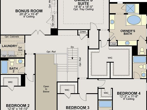 In the Jennings' five-bedroom, 5.5-bath floor plan, the dramatic, two-story foyer leads past a private study and formal dining room to the spacious Great Room, which includes a fireplace. The Great Room, which opens to the expansive breakfast area and screened-in porch, flows neatly into the breakfast nook and island kitchen. Appointed with granite countertops, maple cabinetry, and Whirlpool appliances, the kitchen looks out onto a screened-in porch. A guest suite with full bath is directly adjacent to the generous kitchen, breakfast area, and optional morning room. Upstairs in the Jennings, whose expansive square footage ranges from 4,301 to 4,531, a sumptuous owner's suite boasts spacious side-by-side walk-in closets and a spa-inspired bath, with cultured marble vanities and an optional deluxe bath or freestanding tub. A large bonus room and convenient laundry room complements the thoughtful, family-friendly floor plan.