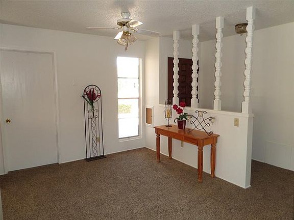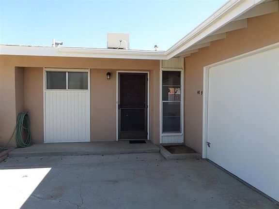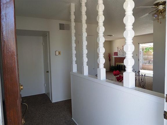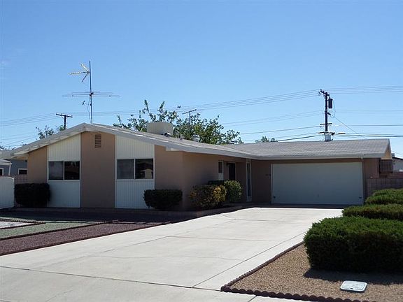 Cinderella's house complete with block wall! Carefree graveled frontyard in geometric design; some bushes on the north side & around house. All fresh paint inside & out. New carpet and vinyl inside!Adorable living rm has floor level brick fireplace and sliding door to view the GREEN backyard.Covered patio has block planters. More planters along back of yard. Lots of lush green grass. On north side of yard are rows of raised seed beds ready to plant.Back inside there is an efficiency kitchen with replaced Maytag gas oven and cooktop, dw, fridge & original tiled counters. Dining area has fan & view of sideyard. Three spacious bedrms. Three storage closets in hallway.Guest bath has tub.Bedrm 3 has paneling; previously the domain of ham operator.Garage has cooler:condition unknown and several workbenches. Newer evap cooler. Very cute!