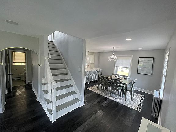 Next you’ll find the stylishly renovated kitchen. This open space features quartz countertops, sleek stainless steel sink, ample cabinetry, new appliances, wine refridgerator and a convenient breakfast bar that invites family and friends to gather and share in the joy of cooking and dining together.