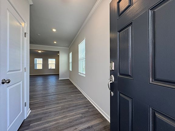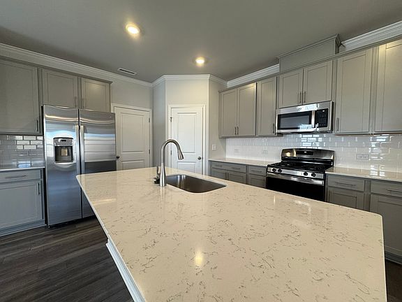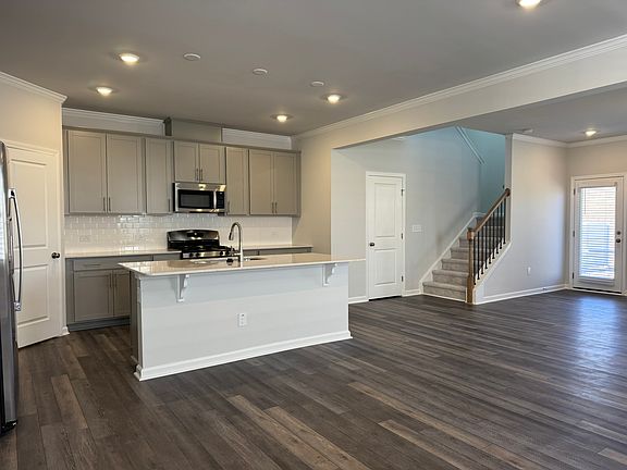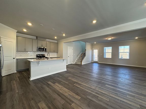 Large open concept living includes large kitchen island with crown molding, quartz countertops, premium cabinet features, gas range, walk-in-pantry.