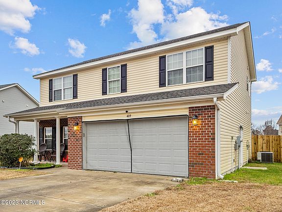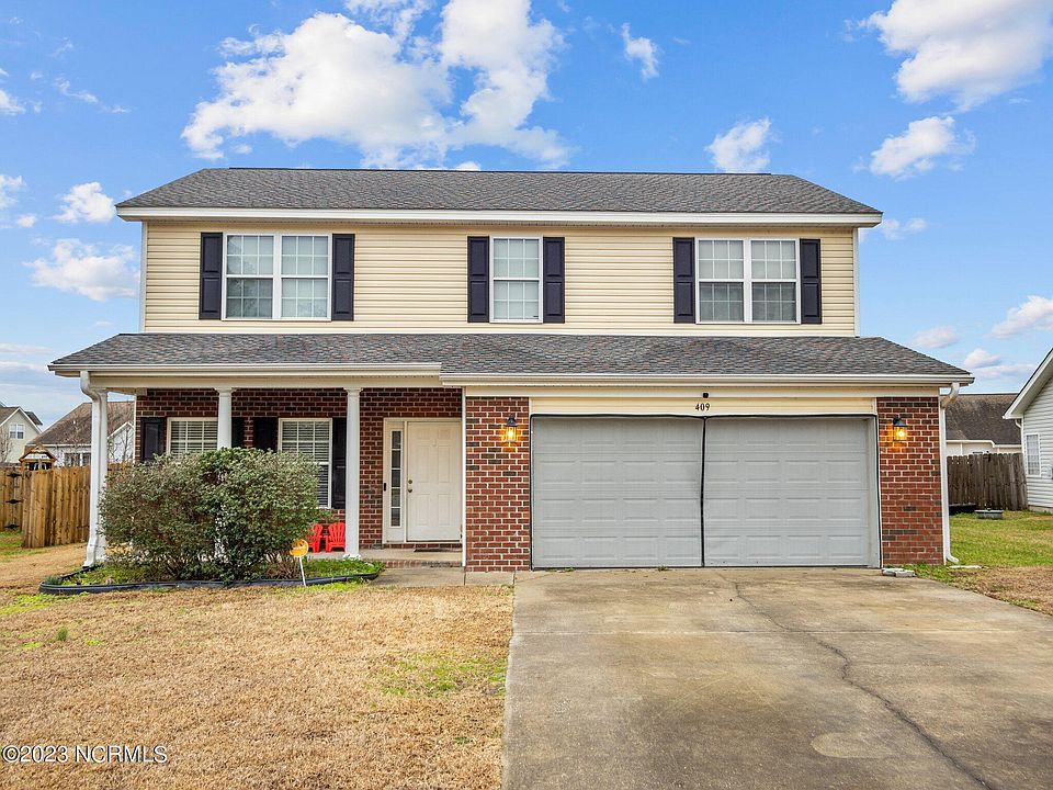 This lovely, well kept home features an easy maintenance exterior of vinyl siding, with beautiful brick accent and covered pillared front porch for that added glamour! You will also enjoy double parking in the brick accented two car garage and the privacy of a large wood fenced backyard! The interior does not disappoint, complete with a family room/flex space just inside, a guest half bathroom downstairs, and a cozy living room with fireplace that is open to the dining area and kitchen! The kitchen boasts tons of cabinet and counter space, tile backsplash, and all stainless steel appliances to include dishwasher, stove, built in microwave and side by side refrigerator, as well as a pantry! All bedrooms are upstairs have ceiling fans, and the fabulous main suite includes a spacious master bath with dual vanity, soaking tub, glass doored shower and walk in closet! This home is conveniently situated in Sterling Farms subdivision, which features it's own community club house and pool! You don't want to miss out on this gem!