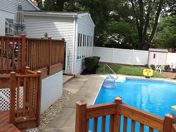 Quaint, tree-lined street and neighborhood. Country-like setting with few street lights and no sidewalks. 2-block walk to elementary school. Middle and High School bus stop right outside at corner. In-ground pool; large 2-level cedar deck - new in 2008; pool and supply shed; mature landscape; new (2015) vinyl fence all around; 2-car garage; home renovated in 2010 -- new hardwood floors (main areas), new ceramic tile floor (kitchen), new carpeting (all 4 bedrooms). Remodeled kitchen and baths. 2 fireplaces, one with insert.