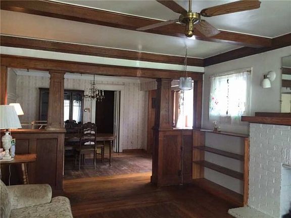 Uncover the potential in this charming Craftsman style bungalow. You will be surpised at the space inside which is deceiving from a passing glance. Oak beans line the living room ceiling and meet its handsome brick fireplace. Columned oak built-ins open this space into the formal dining room, where crown moulding is proudly displayed. Large eat-in kitchen. Inviting hardwood floor perimeters picture frame wide plank at the center. Nicely sized gentle fall away lot.