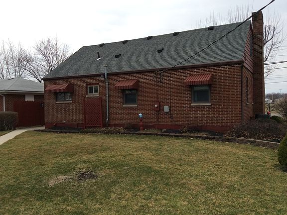 This 1 1/2 story home brick home features a covered front porch, entry, living room with gas fireplace, dining room, kitchen with bar, four beds, 1.5 baths, basement, and a detached two car garage!