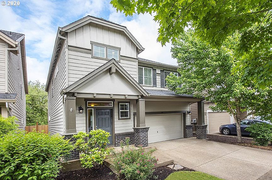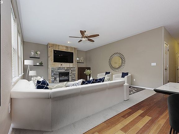 Fabulous home in popular Newberg neighborhood close to shops, parks, and more! Cherry hardwood floors, new carpet, high ceilings, beautiful kitchen w/pantry, built-in micro and fridge. Large master suite w/huge walk-in closet with organizer, ceiling fans throughout, upstairs washer/dryer, central A/C and office/den with built-in shelves. New garage door, fenced yard with deck and firepit patio backing to greenspace! HOA maintains front yard landscaping and common areas.