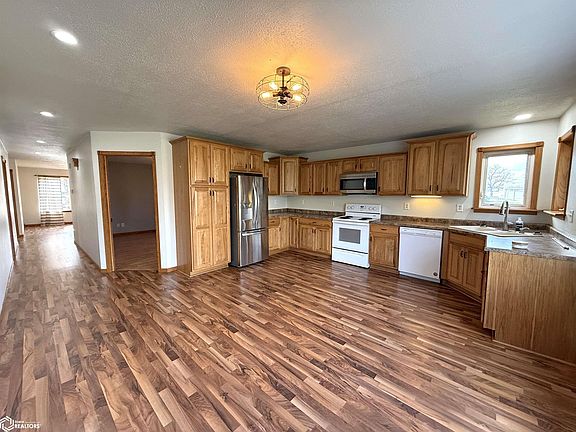 Welcome to your dream property! This stunning ranch style home, built in 2007, combines modern comfort with thoughtful design. Nestled on a generous 0.51-acre lot near the edge of town, this 1,400 sf home has it all. You are greeted by a poured concrete ramp that leads to the front door. Inside you will find a spacious living area bathed in natural light. From here, you will head down the hall to find a primary bedroom and a secondary bedroom. Adjacent to these, the main-level bathroom boasts a walk-in shower, stylish vanity, and plenty of space for daily routines. The kitchen, with its U-shaped layout is as functional as it is beautiful. Gorgeous cabinetry provides ample storage, while included appliances make moving in a breeze. There's also extra room for your dream kitchen island if desired! Located just off the that is the laundry room, furnished with washer & dryer plus a utility sink. Venture downstairs to the fully finished lower level w/ stunning tile flooring. This level features a 3rd bedroom & also has its own half bath. One of the BEST features of this property is the IMPRESSIVE 2,400 square foot SHED nestled in the backyard. Completed in 2024, this shed is outfitted with 1,120 square feet of heated AND cooled space w/ its own half bath, along w/an overhead door & great storage. The additional 1,200 sf remaining unfinished w/2 oversized overhead doors plus a large lean-to on the North. Don’t miss your chance to own this captivating property!