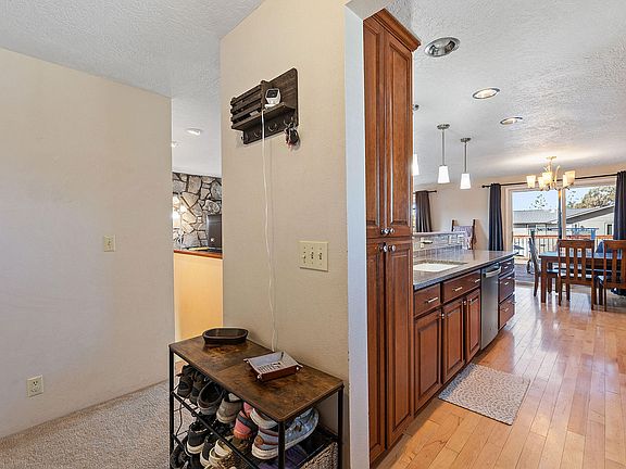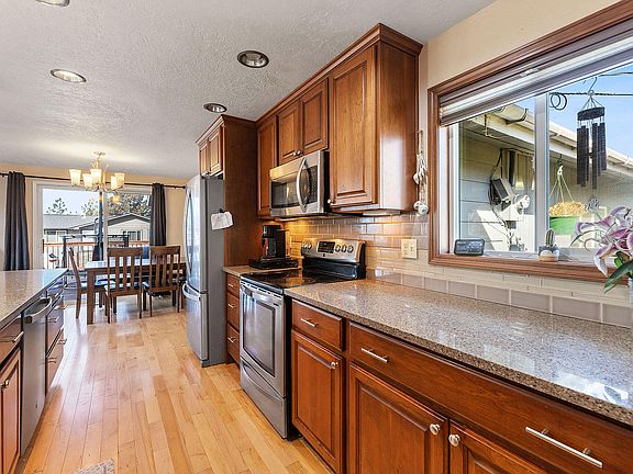 This spacious 4-bedroom with office, 3 -bathroom home offers comfort and charm on a dead end, large corner lot. The inviting living room features a stunning wood-burning stone fireplace, perfect for cozy nights. Enjoy a beautifully updated kitchen with puck and pendant lighting, ample storage throughout, and a daylight basement offering additional living space. Outside, relax on the brand-new deck or in the fenced front or backyard. The oversized two-car garage provides plenty of storage, plus there's room for RV parking. A fantastic opportunity for space, functionality, and home — don't miss out on this great opportunity!