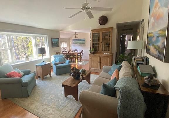 Welcome to Quail Run, nestled off-the-beaten-path in beautiful North Chatham-yet convenient, easy access to all! This immaculate, delightful unit opens into a spacious, warm and welcoming living room with vaulted ceiling, hardwood floors, and new picture window overlooking a peaceful wooded area; the dining room has built-ins and the same wooded views; the efficient kitchen offers good storage, updated counter tops and appliances, and has a door leading to your outside deck with more wooded views! The two bedrooms are nicely sized with hardwood floors and ceiling fans (with the primary containing 4 closets and a direct access to the bathroom). A full-size stackable washer and dryer are included in the sale. In addition, there is a private storage space in the basement (approximately 13'x10') - and an assigned detached carport for each of the 14 units. Quail Run-a peaceful place to call home!