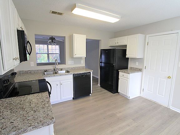 The spacious, eat-in kitchen comes equipped with new black appliances, including a refrigerator, stove, microwave, and dishwasher, and provides ample cabinet space for convenient storage. A separate dining area just off the kitchen offers a versatile space for meals, gatherings, or work-from-home flexibility.