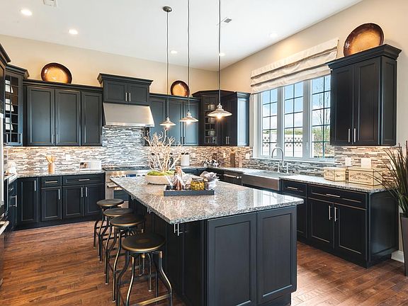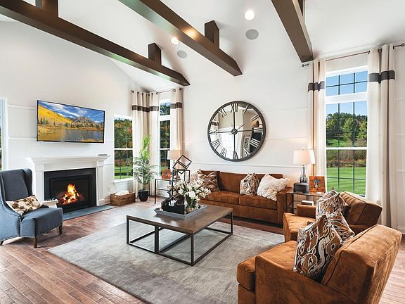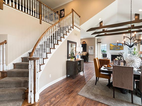 The graceful curved staircase of the exquisitely crafted Kinkade complements the formal living room and the impressive two-story dining room. The open floor plan features a magnificent gourmet kitchen with a large center island that overlooks the light-filled great room with cathedral ceiling. The spacious first-floor primary bedroom suite boasts a large primary bath with a dressing area, walk-in closets, and a luxurious shower. Other highlights include a second-floor overlook, an expansive loft for versatile living space, and secondary bedrooms with walk-in closets. One of the secondary bedrooms features a cathedral ceiling.