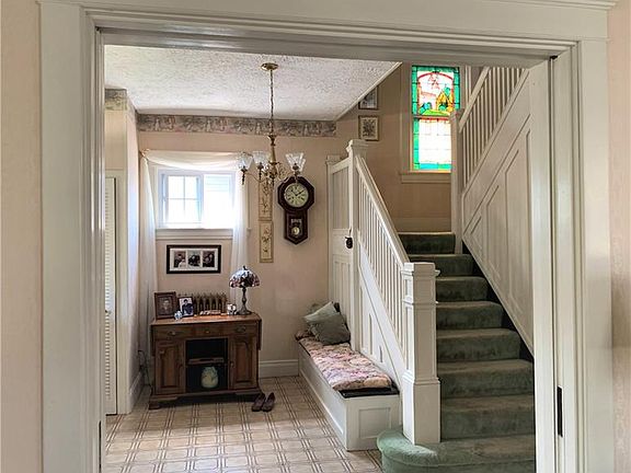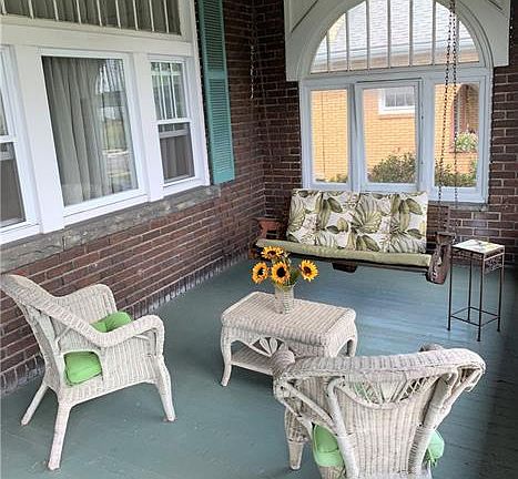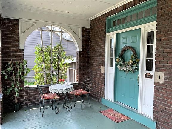 Stately brick home full of charisma! From the inviting front porch, enter the house into a charming foyer with a view of the original stained glass window and pocket door into the living room with a working fireplace! The dining room features a non-working fireplace. Both living and dining rooms have wood beamed ceilings. The kitchen has a country flare with a separate dining nook that has built-in table and seating. There are 2 bonus areas...the lower level family room with a gas burning stove and a screened enclosed porch perfect for additional space in the warmer months. Pittsburgh Potty in basement. The attic is usable for additional space for living quarters or storage. The detached 2 car garage has newly run electrical service and a separate additional storage space in the back. Property is 1 1/2 lots. Well built house - move-in ready. Walking distance to Town Park.
