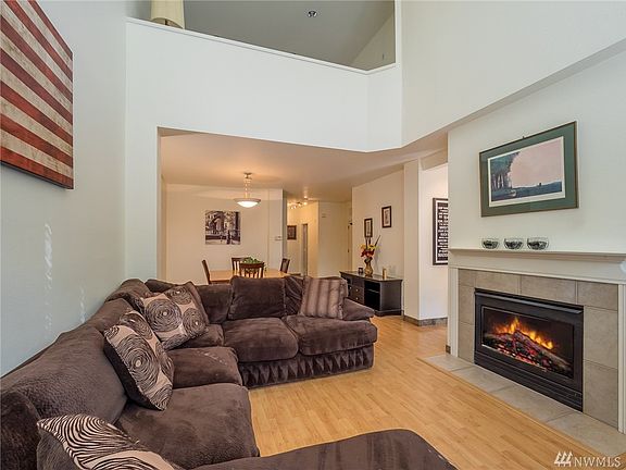Desirable end unit w/2 car garage and A/C. 2-storied living room w/vaulted ceilings & floor to ceiling windows bring in tons of light. Separate dining room. Two-sided gas fireplace between living room and breakfast nook. Large kitchen with pantry opens out to patio. Upper level offers loft overlooking living area and convenient laundry room. Spacious master suite w/ 4-piece attached bath, modern vessel sinks and plenty of storage. Conveniently close to freeway, restaurants, shopping & schools.