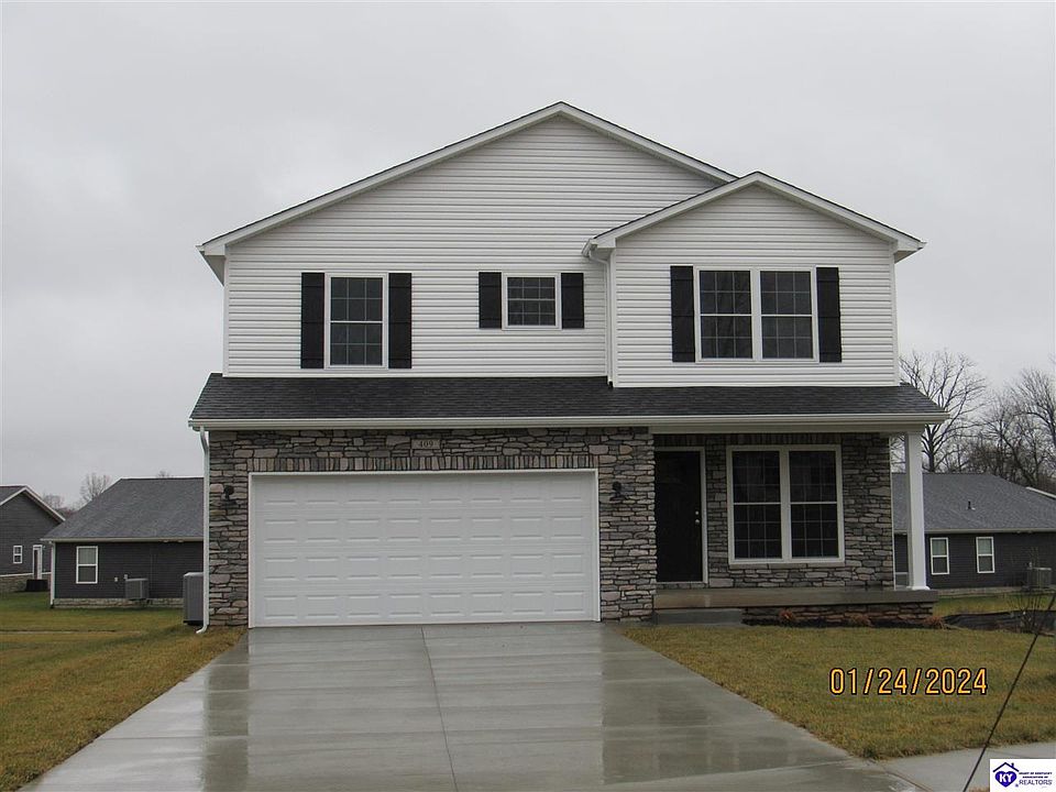 Brand new home with Stone and vinyl, covered front porch. Great room with ceiling fan, white kitchen cabinetry, snack bar peninsula, granite top, pantry closet, walk-out sliding door to deck, and half bath. Upstairs with 3 bedrooms 2 full baths, Primary bedroom has 2 closets and 1 is a walk-in, Primary bath has a shower stall with seat, ceiling fans in all bedrooms, main floor with vinyl wood flooring, steps, and bedrooms with carpet. 10x 12 deck. this is a great home for your family Radon remediation systems installed, 2-10 Home Buyer Warranty