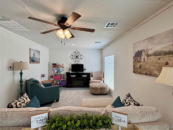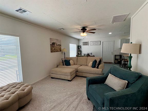 Financing possibilities are FHA, VA, Rural Development & Conventional. Discover the magic of this remarkable transformation! Every detail has been carefully considered, from the gutted structure to the addition of walls, ceilings, sheetrock/bead board walls, electric, plumbing, fixtures, kitchen appliances, paint, floor covering & central heat and air. New windows flood every room w/natural light, complemented by recessed light fixtures & ceiling fans for optimal comfort. All new plumbing & electric have been meticulously installed. Exterior security lighting ensures safety & peace of mind. This unique tiny home has been transformed into your perfect sanctuary. Located w/n 11 miles of Mid America Industrial Park in Pryor Oklahoma & under 5 miles to Lake Hudson. This property has been ingeniously converted into a cozy 2bd/1ba home. Inspired by the vision of a local enthusiast, this space was originally designed to be the ultimate art retreat, for art lovers to sip wine & show their creativity. Plans changed so Authentic Construction converted the floorplan to be the perfect cozy cottage. As you step into the open floor plan, bathed in natural light streaming through 2 lg picture windows in the living & dining area, you will feel right at home. A kitchen has been added to make this home functionable; with a sink, cabinets, countertop, refrigerator, stove, island & pantry to give you the perfect little kitchen. The spacious full bathroom boasts a tub/shower combo, vanity, toilet, tankless hot water heater & a stackable washer and dryer. The master bedroom features a lg walk in closet. While the 2nd bedroom is ideal for an office or child's rm, providing versatility to suit your lifestyle.
