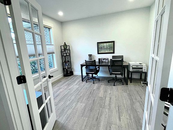 Custom Home, 2420 sq ft., built in 2023, four bedrooms, plus office/den, 2.5 baths, on a wooded cul-de-sac lot. Beautiful Cryptomeria trees border the back, providing privacy, as well as a bird sanctuary! Enter 12’ high ceiling foyer, with custom hanging fixture, and coat closet, to left French doors open to office/den, to your right a formal dining room, with vaulted ceiling, hanging chandelier and large front window, currently used as a reading room. Just beyond, a classic railed stairway and entry into the light filled great room with 18’ beamed and vaulted ceiling, 6’ high windows, and gas log fireplace (TV/Cable connection behind mirror). The great room flows into the breakfast area with ceiling fan and then into chef’s kitchen with granite bar and counter tops, custom pendants, white farmhouse sink, stainless steel appliances, new LG Gas Range, free-standing kitchen island, soft-close cabinets galore, plus separate walk-in pantry. From the breakfast area, a French door opens to an “outdoor” room (12’x12’) with ceiling fan and sun/privacy screen, three steps down to a new second deck (10’x16’) with BBQ Gazebo, and access down to large backyard. Great space for morning coffee or entertaining! The spacious Master suite, also on the main floor, includes high tray ceiling with newly installed fan/light, master bathroom with new custom mirrors, soaking tub, oversized tiled shower, separate water closet and walk-in closet. A hall powder room and laundry room with cabinets, sink, new washer/dryer and access to garage, complete the main floor. Upstairs, there are three bedrooms, all with walk-in closets, one bedroom being used as a workout room, a hall storage closet, access to attic and a full bathroom, double sinks with toilet and shower/tub together in separate water closet. Home has Luxury Laminate and Ceramic Tile Flooring. Features: Additions by owners, Custom window treatments added throughout, additional electrical work, 220 volt and multiple dimmer switches, Springwell whole house water filter, and Moen water flow monitor app, in large 6’ high ceiling crawl space (more great storage space). Owner had gas line brought from curb to the home, for new gas range, and to complete the firebox that came with the home, adding custom non-vented gas logs. (Gas is now available for other use). The 18’ “fireplace wall was professionally painted, and a mantel installed. Owners added ceiling fans, the additional custom-built deck with BBQ Gazebo, Fencing and front yard landscaping! Close to schools. shopping, dining, services, dog friendly park trails, healthcare.