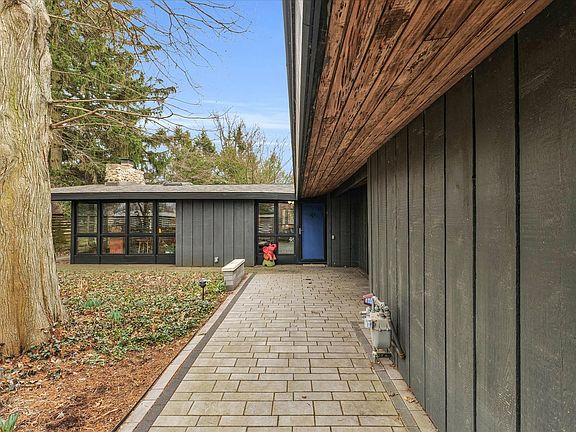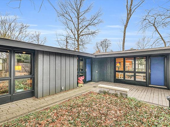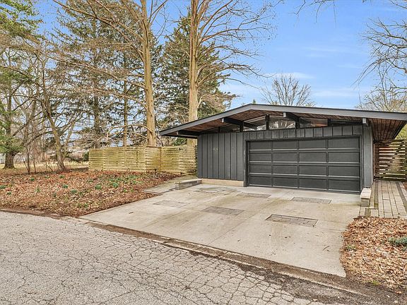 One-of-a-Kind, mid-century modern tucked away on a quiet cul-de-sac near the University of Illinois. Nestled amongst mature trees, there is an opportunity to commune with nature from nearly every room of this sprawling ranch. Just on the other side of the custom fence is a charming neighborhood park. Perfect for entertaining from its open living room space to the outdoor patio areas with string lighting. Unique interior features include: vaulted, worm wood ceilings; stone fireplace flanked by floor-to-ceiling windows; brick floors and built-ins. The designer kitchen features modern cabinetry, quartz counters and stainless appliances. Right off the living room is a guest bath and down the hall are three bedrooms and two more baths. There is a den/study with custom bookshelves and a separate entry access. This wooded lot is breathtaking all seasons and has lush natural foliage. Unlike any home you've ever seen, it is the perfect blend of style, comfort and convenience.