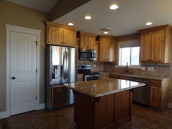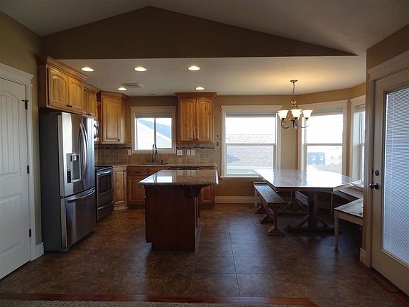 Location and views! Close to the hospital, University and interstate access with views of American Falls Reservoir. Open floor plan with split BR concept, vaulted ceilings and gas fireplace. The kitchen has a pantry, huge fridge, and beautiful cabinets. Master BR has walk in closet, separate shower, jetted tub and double sinks. Walk out basement has huge FR with gas fireplace, 2 LG BRs + almost finished den with water hook ups for sink or whatever. Play set, gazebo and shed stay. Fenced back yard, sprinklers with drip system to flower beds and extra hook up to garden spot, peach and honeycrisp apple trees.