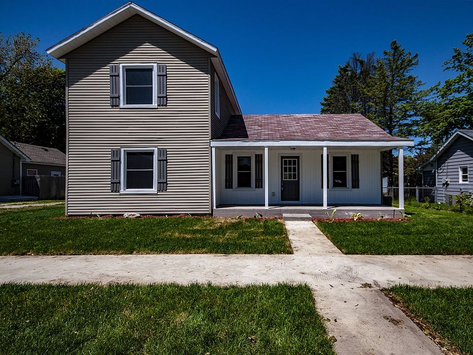 Back on market-no fault of seller. Completely remodeled home in New Prairie School district. New windows, new flooring, new a/c, new bathroom fixtures, new kitchen cabinets and counters, fresh paint, new siding, new poured sidewalks and more. This home offers 4 bedrooms and 2 baths. Large open concept home with eat in dining and updated kitchen. Main level has 2 bedrooms and 1 bath as well as a spacious living room with fire place. Upper level has 2 additional bedrooms and a bathroom with stand up tiled shower. Main level laundry as well as large pantry. You will love the covered front porch and rear deck for entertaining as well as the detached 2 car oversized garage.
