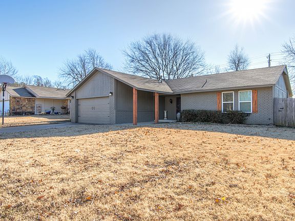 On-trend colors in this stylish one-level South Broken Arrow home! Welcoming large covered front porch. Spacious living rm with gas log FP. Updated kitchen with SS appliances, refrigerator stays! Breakfast nook has accent shiplap wall and great views of backyard. Envious master bath with beautiful tiled walk-in shower. All bedrooms have walk-in closets. It's not cold outside when you can cozy-up to the outdoor fire pit! Covered patio area has deck and an extended stone patio area. Home back to greenbelt.