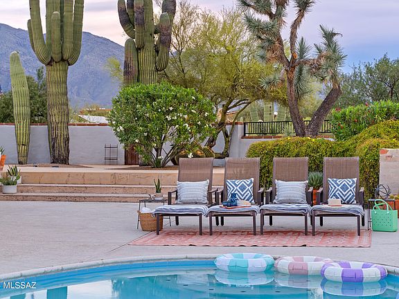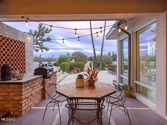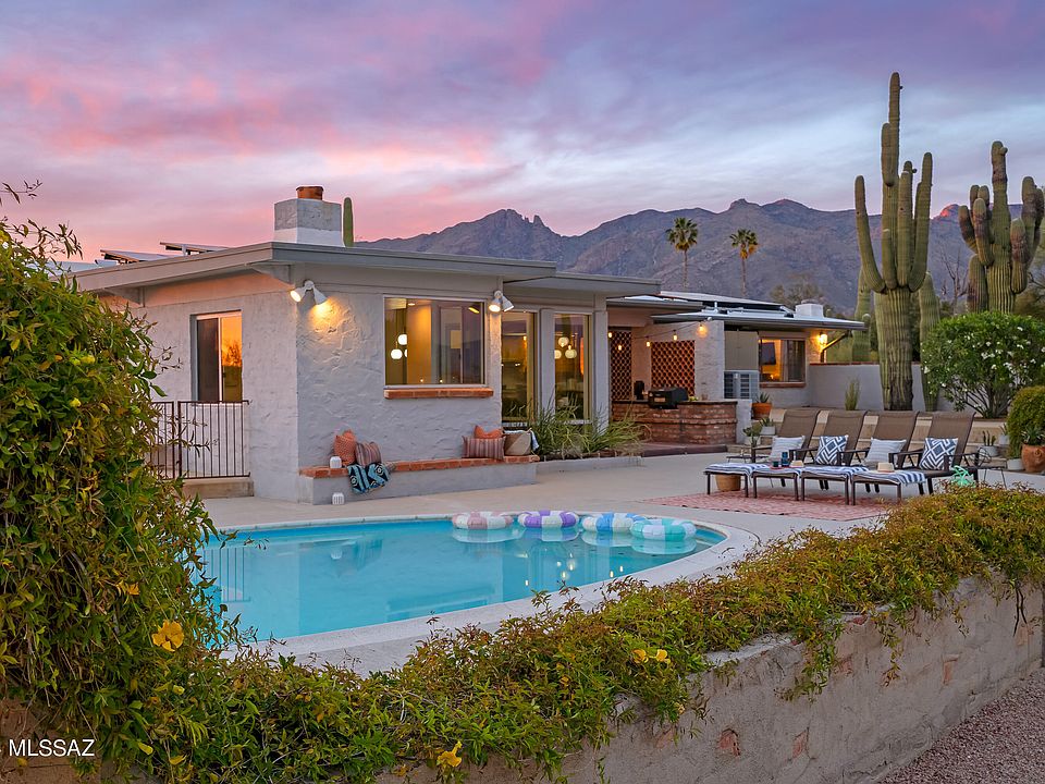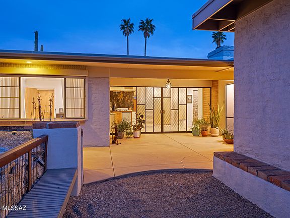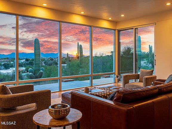 Sited on over an acre, this Midcentury Adobe home was designed by architect Dave Fraker. Abundant windows and a sprawling open plan position this home for premium views of our Tucson mountains and city lights. Floor to ceiling glass and modern design details make this home one of the finest in the Catalina Foothills. Quartz countertops, stainless steel appliances, and custom pantry complete the well appointed kitchen. The primary suite offers two walk-in closets, kiva fireplace (one of four fireplaces in the home), and spacious updated bathroom. Two additional bedrooms and a den/office overlooking the pool and skyline. The grounds include a pool, sport court, saguaro studded veranda, and ample parking. Just a short drive to hospitals, schools, and The Loop (rillito bike path). Owned solar, blown-in insulation, energy efficient tankless water heater, commercial grade exterior doors, roll down shutter and a whole house generator. This home offers superb energy efficiency.