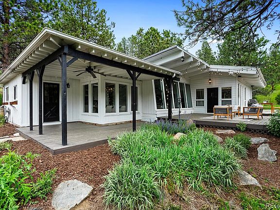 Welcome to your Colorado dream home set on almost an acre and a half just above Upper Bear Creek. This mid-century mountain farmhouse with southern exposure boasts a wraparound porch to enjoy your breathtaking oasis while listening to the relaxing sound of Bear Creek. An open concept floor plan with walls of windows brings the outside in while the soaring wood beam ceilings offer a sense of comfort and style. The main living area features a wood burning fireplace with stone surround and rich hardwood floors. The recently updated kitchen features dolomite countertops, backsplash, original handmade farmhouse cabinetry and a large sink with new fixtures. Oversized walk-in pantry with built-ins and spice rack. Entertain in the large and light filled dining space. The expansive primary retreat features vaulted wood beam ceilings and large, thoughtfully placed windows. Updated spa-like bathroom with sliding barn door, designer lighting and accents. A custom wood vanity, basin sink and tiled shower blend contemporary and classic elements. The large walk-in closet is complete with built-ins and pullout drawers for optimal organization. Two additional bedrooms with hardwood floors are near the updated full bathroom with shower and large, separate soaking tub. A bonus room features a sauna and flex space to make your own. The serene setting on a flat lot with mature trees and landscaping offers a dreamer’s escape. A rustic and quaint guest cabin with electricity and wood burning stove is located towards the back of the lot. An oversized 2-car detached garage adds privacy from the road and includes an electric car charger, built-in work benches and additional storage space. Garden beds, a staircase to a hidden lookout, and tiered landscaping add to this true retreat. Located only three miles from Evergreen Lake, Evergreen Golf Course and Main Street with an abundance of shopping and restaurants. Don’t miss the chance to call this gorgeous home your own.