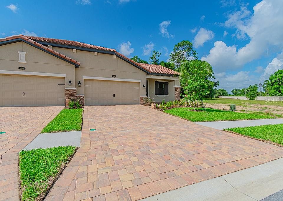 A quaint covered porch greets you at this home's entrance, and once inside, you'll find generous flex space to use as you see fit. Imagine a charming reading nook or a robust library here. You can even create a fresh take on the old-fashioned parlor. As you continue through the entry, the second bedroom sits on your right, but you have options for personalizing this bedroom and flex space, including converting the flex space into a third bedroom. On the left is a full bath that serves the second bedroom and is convenient for guests as well. Just beyond that, a formal dining area awaits with easy flow to the kitchen on the left and the family room straight ahead. This seamless connectivity makes family gatherings easy and ensures that everyone stays involved, be it catching up on the day while dinner is being prepared, or relaxing after dinner with popcorn and a movie. The kitchen features a walk-in pantry and convenient access to the utility room and garage, whereas the family room opens to the covered lanai for outdoor enjoyment. To the left and back of the family room is the master suite that also looks out to the backyard. And then there's your personal retreat, the master bath, complete with a dual vanity, a large walk-in shower, a private commode area, and a grand walk-in closet. Come visit to see this great floor plan design for yourself. Call today to schedule a tour!