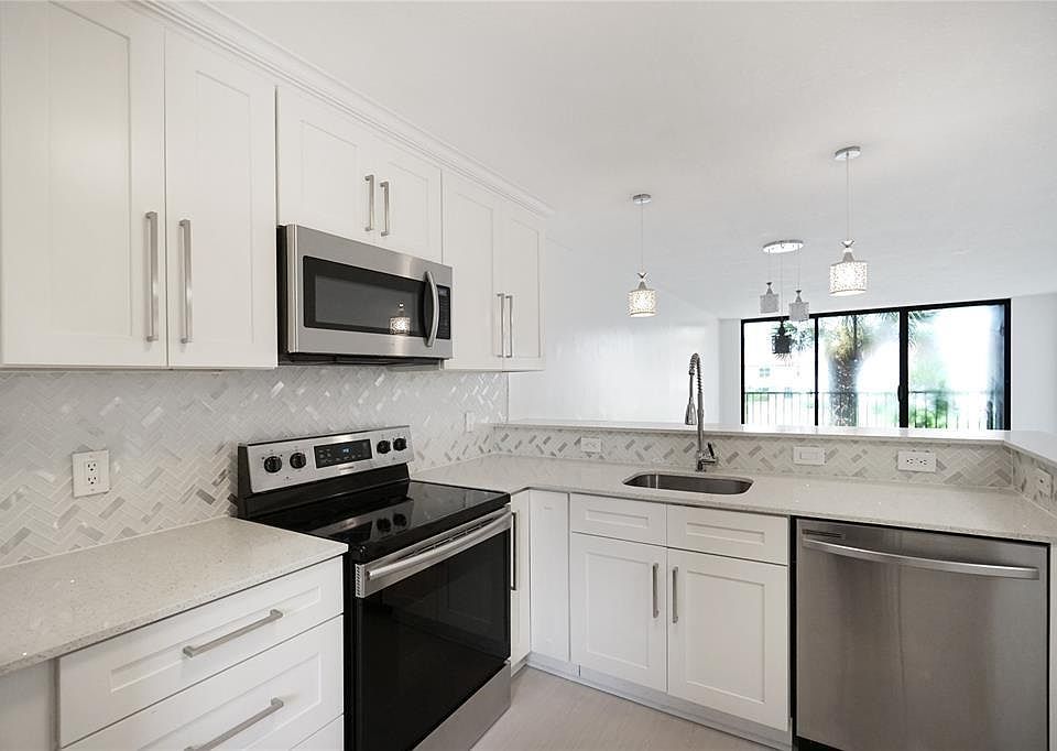 **NO ASSESSMENTS** Welcome to The Fountains of Palm Beach a beautifully maintained 55+ Gated Community offering comfort, convenience, & resort-style living! This fully renovated 2B/2B condo features a bright, open layout with serene water views from the screened-in balcony. Enjoy modern upgrades throughout, including a stylish kitchen with white cabinetry, quartz countertops, S/S appliances, & a convenient **IN-UNIT WASHER & DRYER**. Additional highlights include new laminate flooring, freshly painted interiors, updated bathrooms, & walk-in closets. Extra storage space is also included. Enjoy resort-style amenities: clubhouse, pool, tennis, fitness room, 24/7 security & more. Unit comes with 1 Assigned Parking Space + ample guest parking. Close to dining, shopping & highways. See it today!