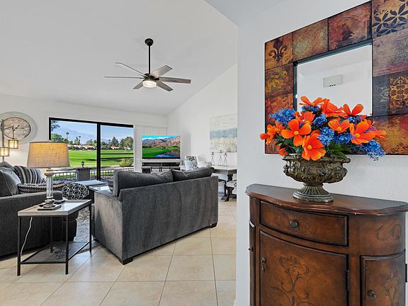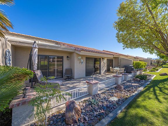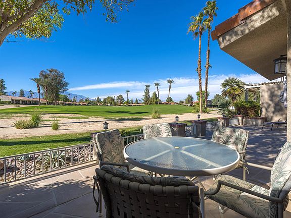Palm Desert Resort - This 2 bedroom, 2 bath Forest Hills floorplan is ready for you to enjoy. On the 12th green with expansive mountain and golf course views. Sold furnished with a few exclusions. Inside features include diagonally laid tile throughout except bedrooms, updated lighting and shutters to name a few. Kitchen has breakfast bar, oversized double sink and lots of storage. 2 suites on opposite sides of the unit allow for privacy and space from your guests. Each bedroom has slider to rear patio and oversized closet - one having a large walk in with locked off owners closet and the other having 2 sliding door closets, offering ample storage and organization spaces. Both bathrooms have been updated with modern white cabinets, beautiful countertops and glass shower doors. One bath has stall shower while the other has shower/tub combo, giving you all the options you may desire. Laundry has its own space INSIDE the home. Rear patio has multiple sitting areas, small wrought iron gate, landscape lighting and expansive view. This unit is rented for January, February and March giving you IMMEDIATE income and making this priced below market, for those purchasing as investment. Don't let this one get away! (See docs for golf rates & pool map)